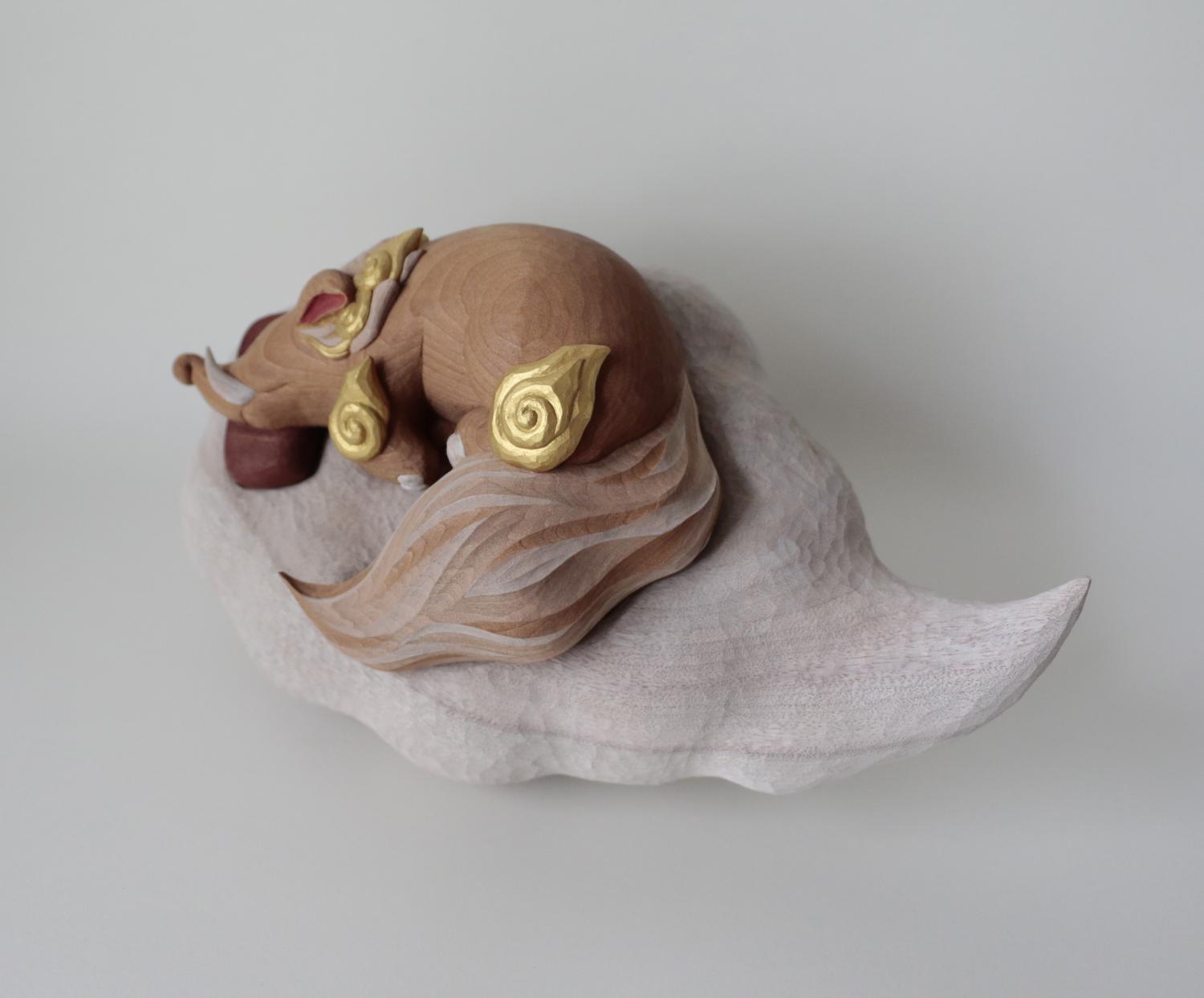 - 簡介: The baku is said to be a spiritual beast that eats nightmares. In the past, people would place images of the baku or the character “獏” (baku) under their pillows, or lay prints of the baku character under their pillow, while they slept. So what kind of dreams does the baku itself have? I imagined it sleeping on its favorite pillow in its celestial home, and created this work with that vision in mind.